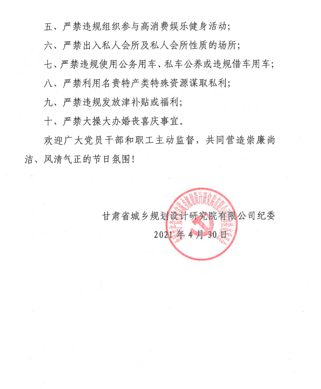 甘肅省城鄉(xiāng)規(guī)劃設(shè)計(jì)研究院有限公司紀(jì)委2021年“五一”端午期間廉潔提醒函